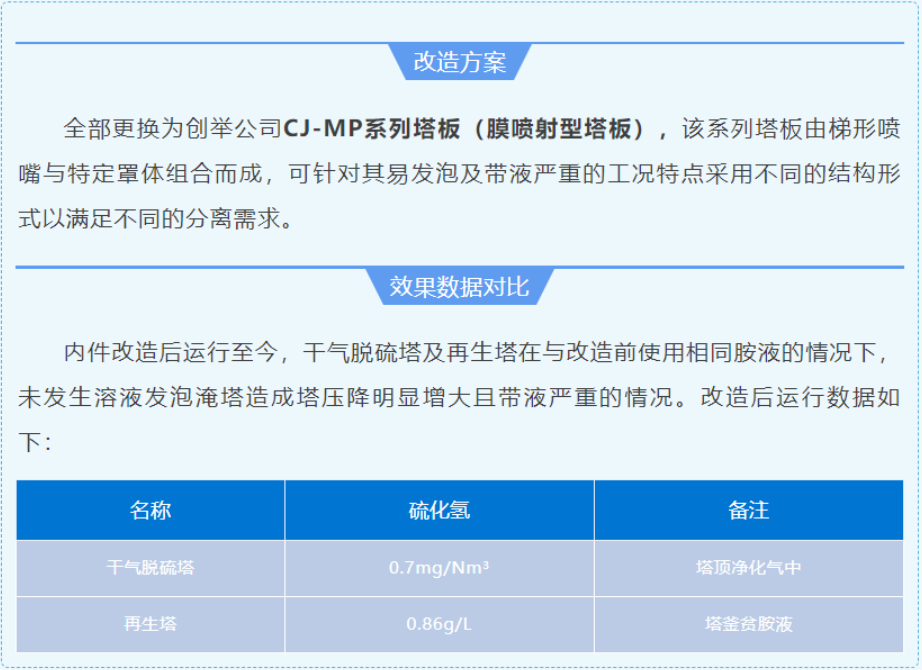 全部工程改造完工后,各項(xiàng)技術(shù)指標(biāo)均滿足生產(chǎn)要求,達(dá)到了改造的目的和預(yù)期,緩解業(yè)主單位的環(huán)保壓力的同時(shí)延長了設(shè)備檢修周期。創(chuàng)舉公司新型CJ系列高效噴射態(tài)塔盤技術(shù)在脫硫化氫塔、干氣脫硫塔及再生塔的應(yīng)用效果,得到了榆林煉化領(lǐng)導(dǎo)的高度認(rèn)可。該項(xiàng)目的順利開車是創(chuàng)舉公司在行業(yè)內(nèi)的又一次成功改造案例。