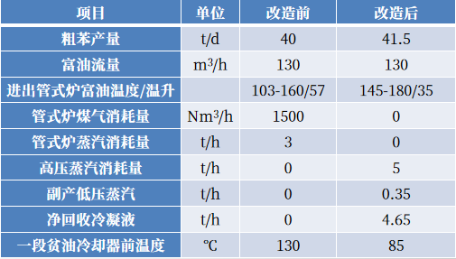 針對一、二期粗苯現(xiàn)場貧富油換熱效率低下、導致富油加熱器負荷過大的問題,我司建議新上一級貧富油換熱器,與原有貧富油換熱器串聯(lián)使用。采取該措施,首先可以提高富油進富油換熱器的溫度,降低蒸汽消耗,提高對貧油熱量的利用率;此外還能減小貧油冷卻器的熱負荷,減少冷卻水耗量。