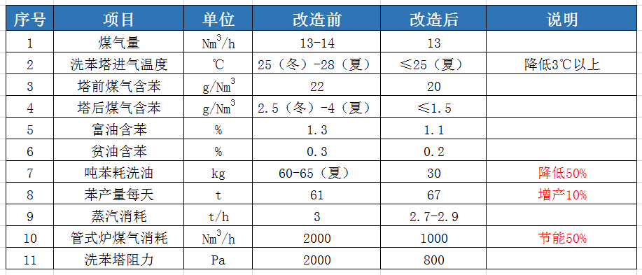 3) 噸苯耗洗油:由之前的約60 kg降低到約30kg,降低50%;
