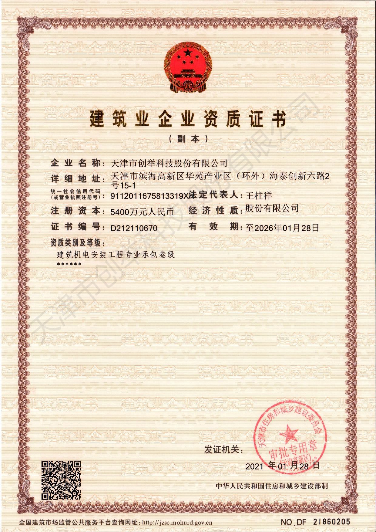 近日,天津市創(chuàng)舉科技股份有限公司(以下簡稱“創(chuàng)舉科技”)申請的“建筑機(jī)電安裝工程專業(yè)承包三級資質(zhì)”順利通過天津市住房和城鄉(xiāng)建設(shè)委員會核準(zhǔn),并取得了相應(yīng)的資質(zhì)證書。