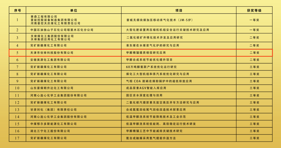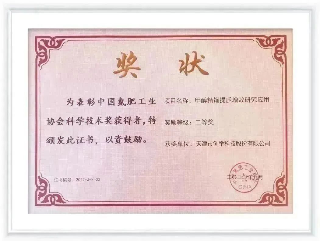 會上,中國氮肥工業(yè)協(xié)會對科技創(chuàng)新方面做出突出貢獻(xiàn)的企業(yè)進(jìn)行了表彰。天津市創(chuàng)舉科技股份有限公司(以下簡稱“創(chuàng)舉科技”)申報的“甲醇精餾提質(zhì)增效研究應(yīng)用”項目,榮獲中國氮肥工業(yè)協(xié)會科學(xué)技術(shù)獎二等獎。