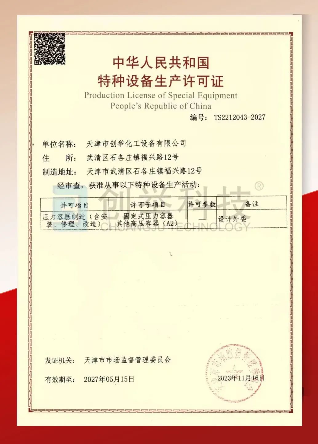 近日,國家市場監(jiān)督管理總局委托天津特檢協(xié)會對天津市創(chuàng)舉化工設(shè)備有限公司(以下簡稱“創(chuàng)舉化工設(shè)備”)A2壓力容器制造資質(zhì)進行現(xiàn)場評審。